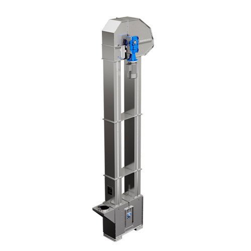 One of the most efficient ways to elevate bulk materials vertically is with a bucket elevator. A Bucket Elevator consists of a series of buckets attached to a belt or chain with pulleys or sprockets located at the top and bottom of the unit. The buckets are in a casing or housing to contain the material. Bulk materials are loaded into each bucket as the bucket moves past an inlet point.