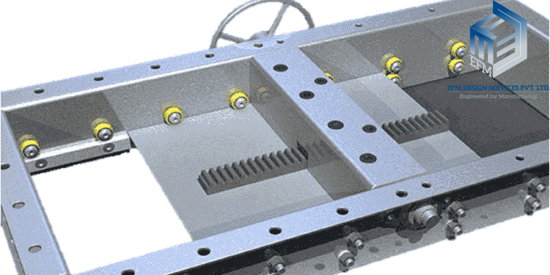 As the name implies, the rack and pinion slide gates work on the principle of a rack and pinion gear set. When activated, this rack and pinion mechanism moves the slide plate open or closed with the help of a hand wheel, rollers and plate retainers.